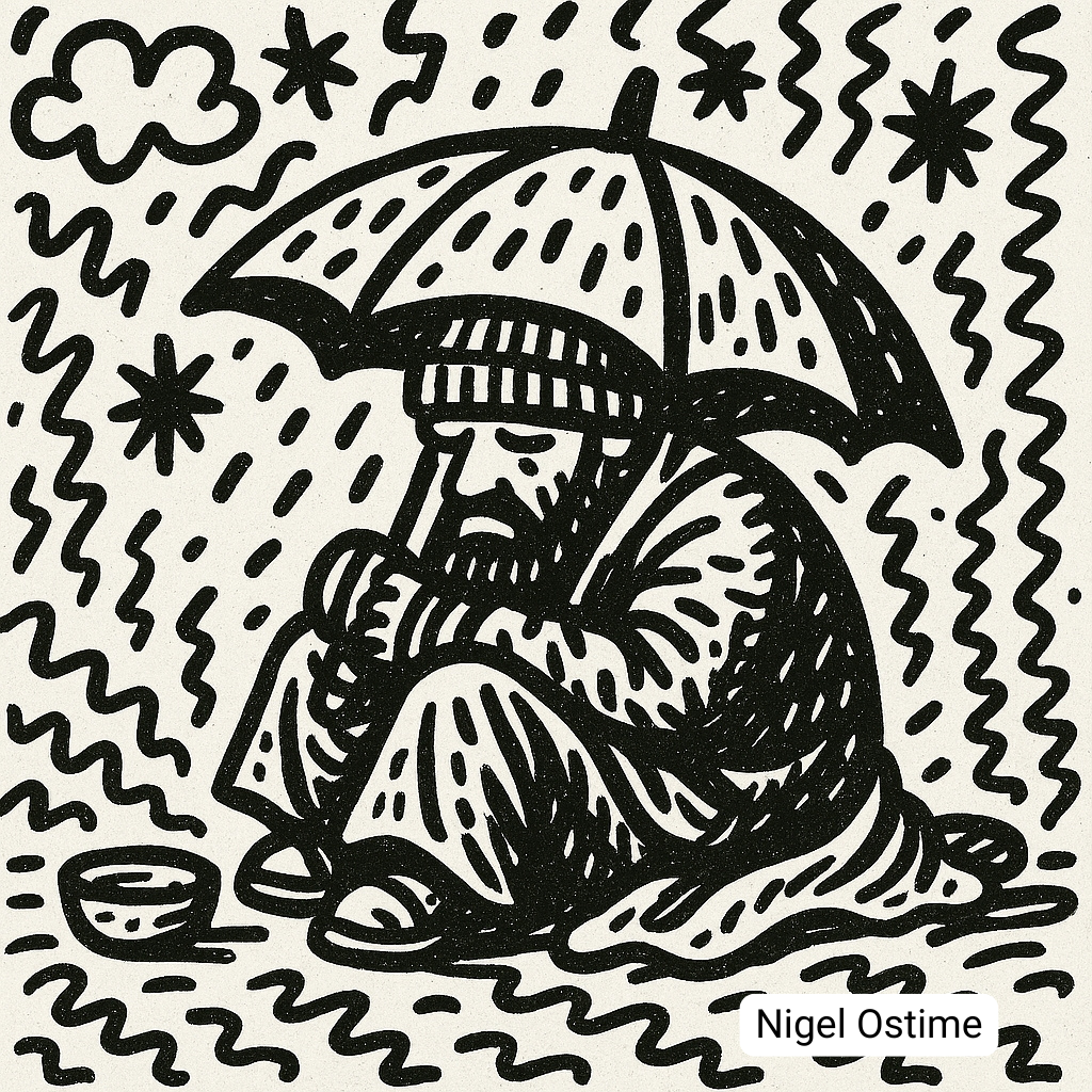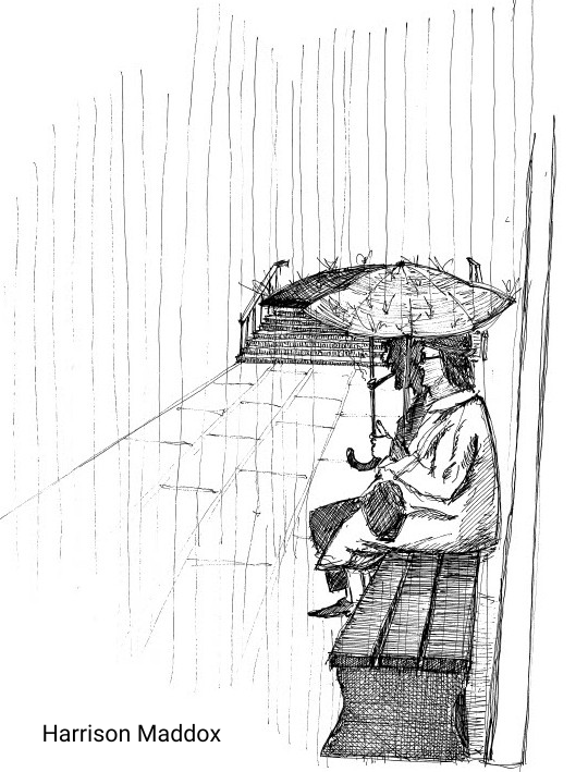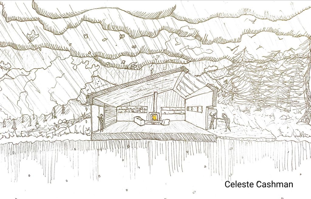 A beautifully crafted piece that presents shelter through nature, tranquility, and human connection to place. The delicacy of the line work, combined with careful balance of foreground and landscape, gives the drawing a peaceful clarity and harmonious composition that draws you in. It conveys a quiet refuge away from noise and urgency, showing how shelter can be found in solitude, in nature, and in spaces that offer pause.