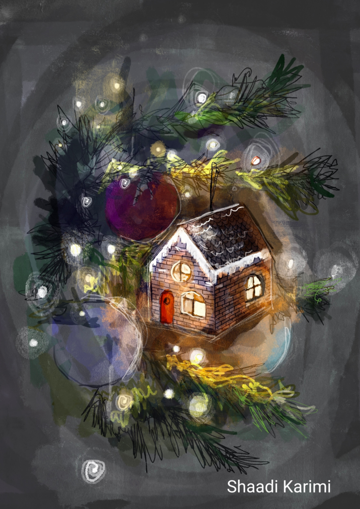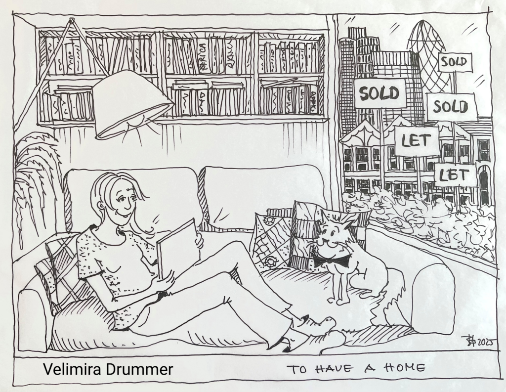 This drawing offers a profound interpretation of shelter as an emotional and psychological space. The central figure is surrounded by protective gestures that create a quiet moment of inner refuge. The careful balance of symbolism and expressive line work gives the piece a strong narrative presence, drawing the viewer into the subject’s inner world. It shows shelter as something created through care, empathy, and connection.