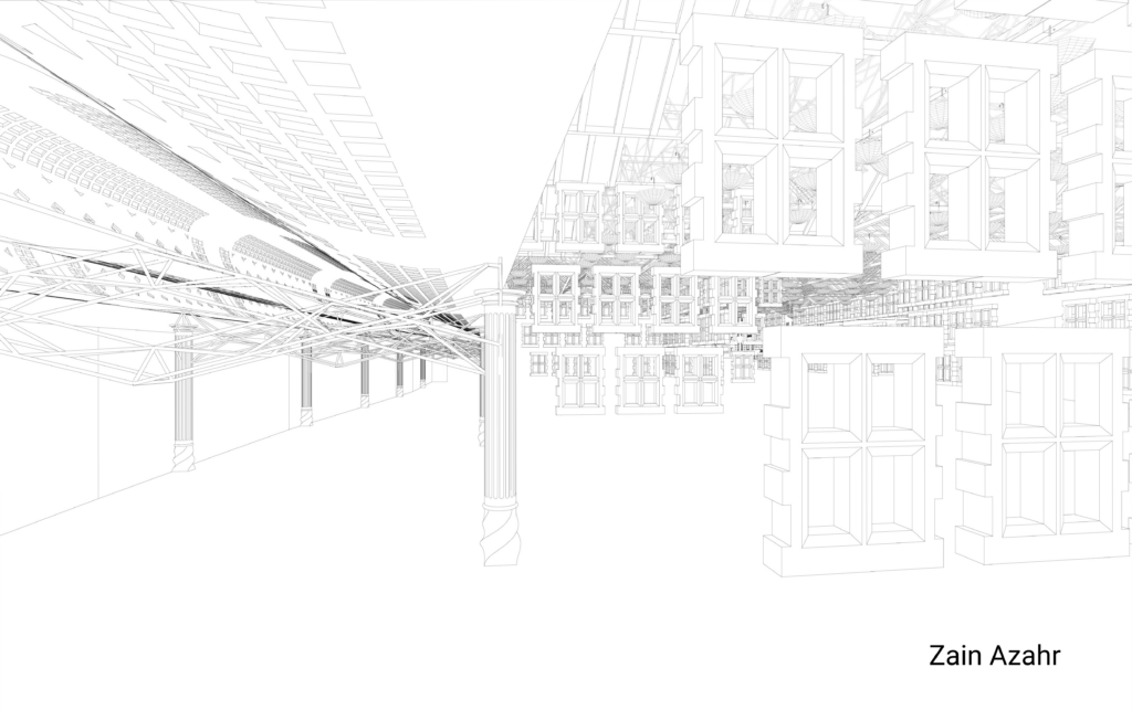 A complex, well-proportioned drawing that offers a thoughtful interpretation of shelter within a contemporary setting. The composition places people beneath a vast mechanical canopy, creating a striking contrast between human scale and structural form. The piece captures shelter not only as a place of physical safety but also as a shared social experience.